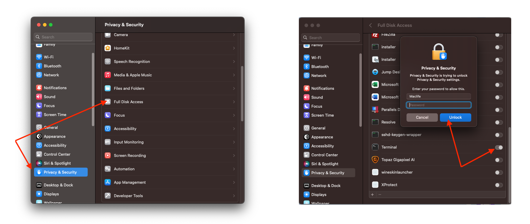 2. Cấp quyền cho terminal như hướng dẫn ở hình này