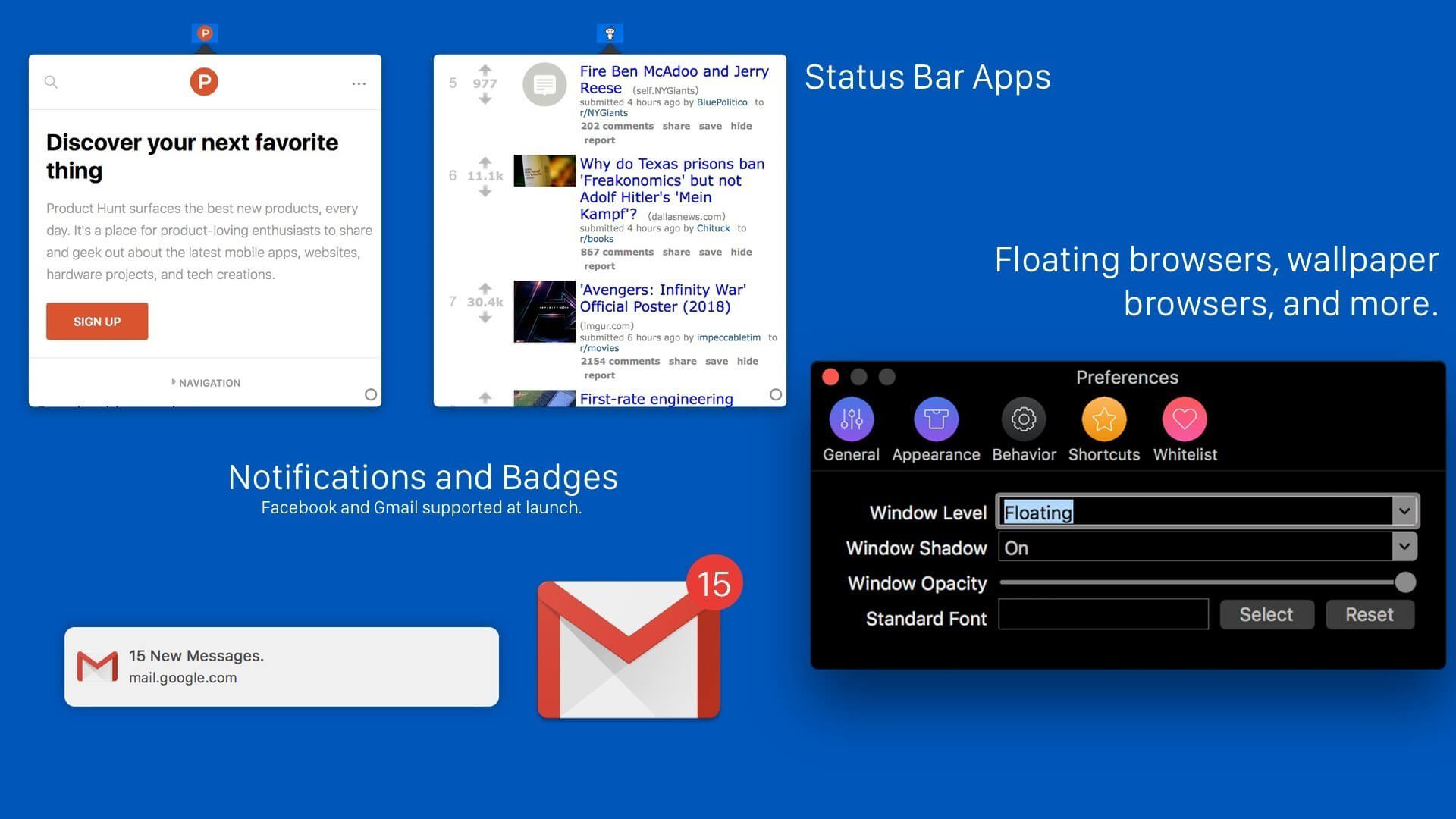 Mỗi ứng dụng Unite có trình duyệt riêng, trong khi vẫn cực kỳ nhỏ và đầy đủ tính năng. Và, vì các ứng dụng Unite là mỗi trình duyệt duy nhất, chúng có các cài đặt và cookie riêng biệt, cũng như hỗ trợ cho tập lệnh người dùng và kiểu người dùng. Ngoài các tính năng duyệt web hiện đại, các ứng dụng Unite bao gồm các tính năng dành riêng cho macOS, bao gồm thông báo, hỗ trợ TouchBar, khả năng ghim ứng dụng vào thanh trạng thái và hơn thế nữa.